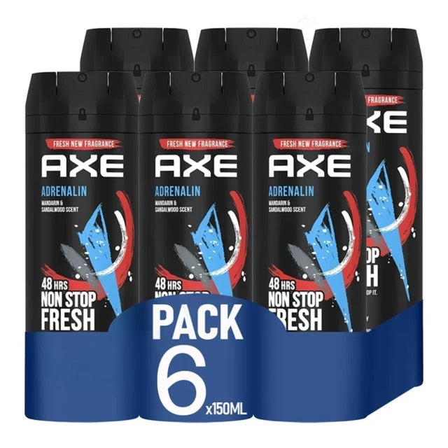 Unleash your energy with AXE Adrenalin Deodorant Body Spray for Men, crafted with the refreshing zest of mandarin blended with the warm, masculine notes of sandalwood. Designed for unstoppable confidence, this deodorant body spray provides 48 hours of long-lasting freshness and odor protection so you stay cool and in control no matter where the day takes you. Perfect for daily use, active lifestyles, and special occasions, AXE Adrenalin keeps you smelling great and feeling energized. This wholesale pack of 6 offers unbeatable value for retailers, resellers, and bulk buyers.