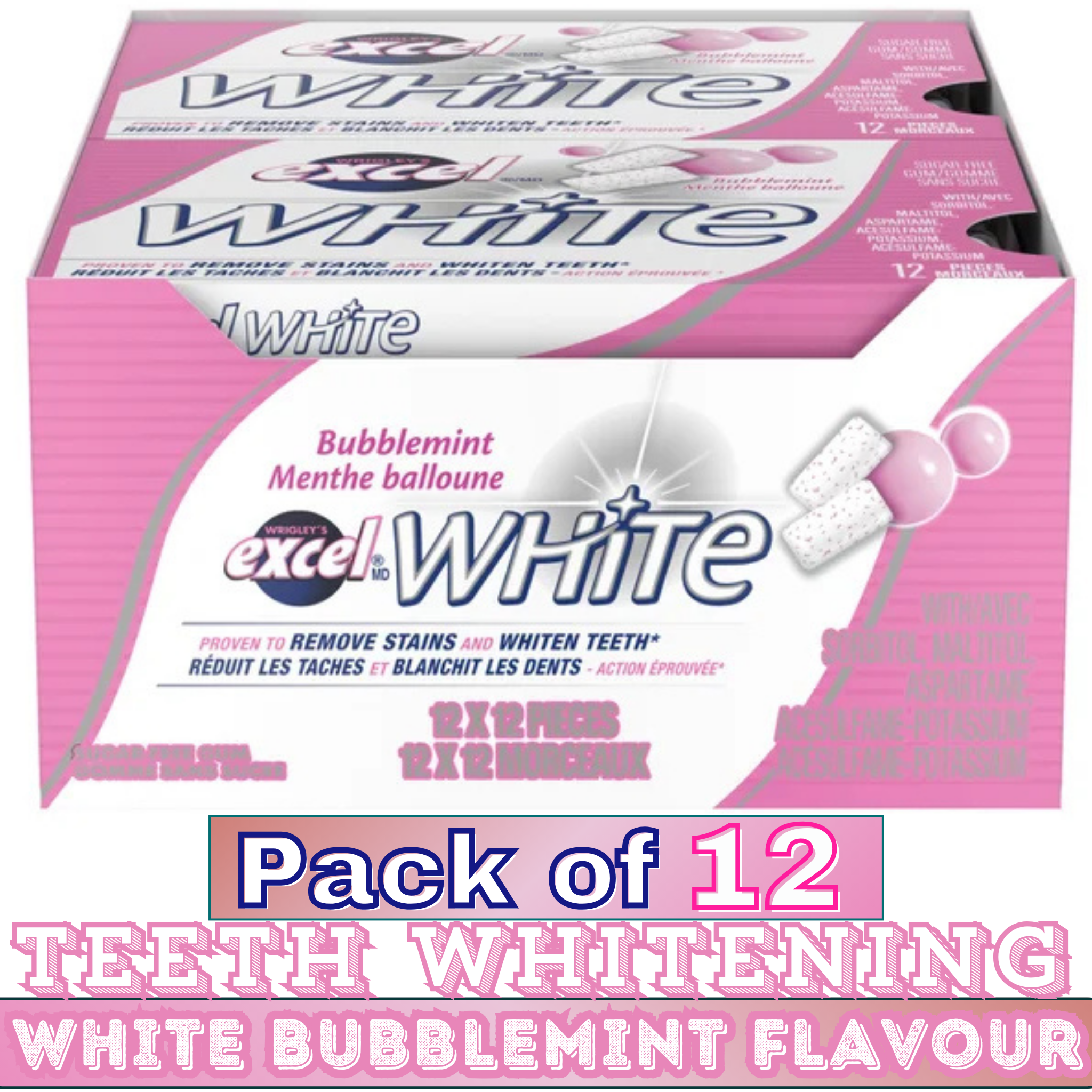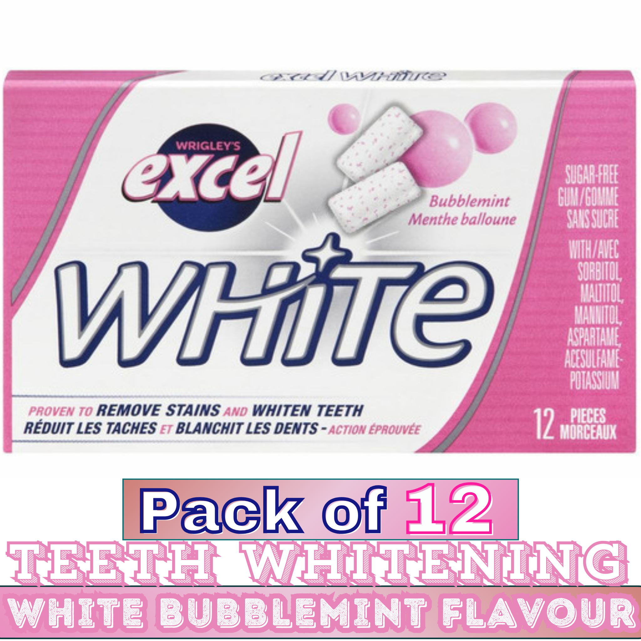 ❃ Product Name: EXCEL White Bubblemint Sugar-Free Chewing Gum with Teeth Whitening – 12 Packs (12 Pieces Each)